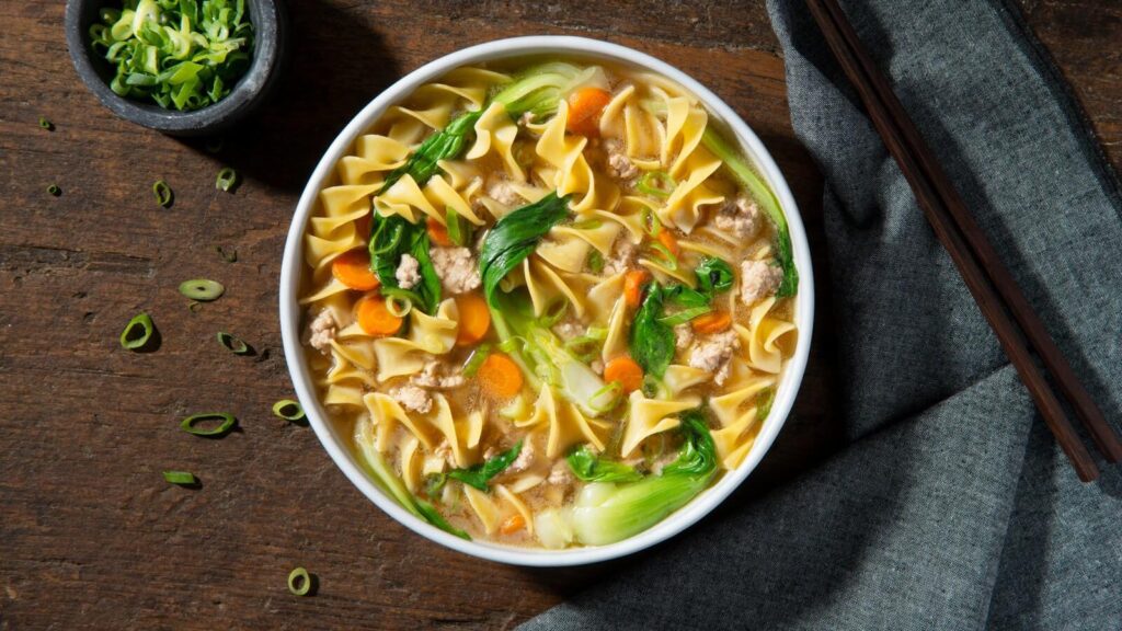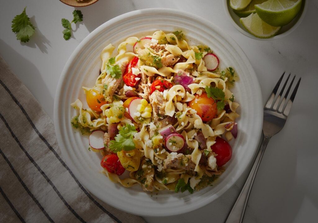 Flavored with chipotle, pineapple and lime, this pork and noodle soup inspired by tacos al pastor is garnished with avocado, cilantro and crumbled feta cheese.