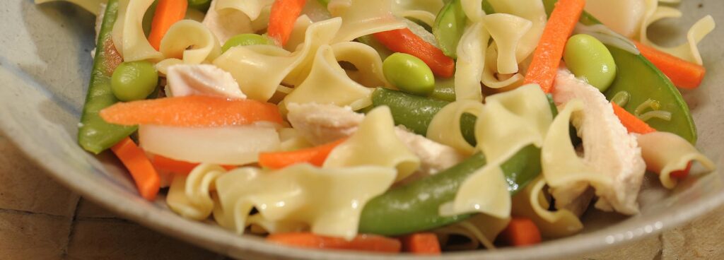 - Cook noodles according to package directions. Reserve 1/4 cup cooking liquid; drain noodles.